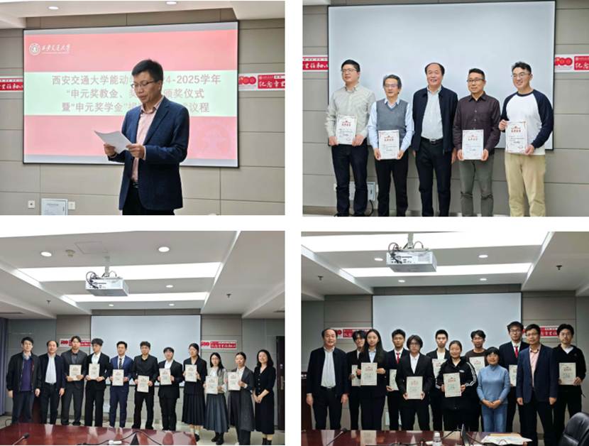 随后由何志龙教授宣读2025年能动学院申元奖教金、申元奖学金的获奖决定。并由赵东升先生、刘昶志先生、韦娜老师、何志龙教授、郭蓓副教授分别为获奖教师及研究生、本科生分别颁发了获奖证书,并向获奖学生表示祝贺。此次共有5位教师获得申元奖教金,17名学生获得申元奖学金,其中研究生8名,本科生9名。