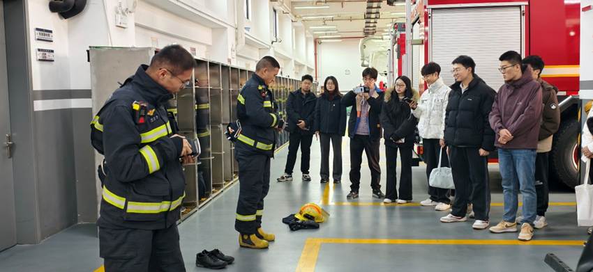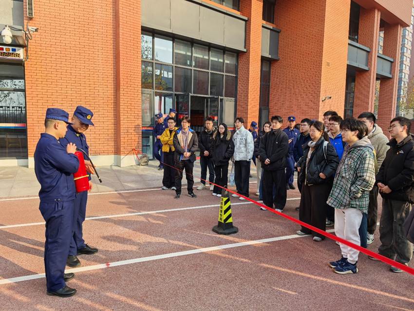 “出警就是与时间赛跑。”在实操演示环节,消防指战员现场展示了战斗服穿戴流程。从佩戴头盔、穿防护服,到系紧腰带、登靴,整套动作行云流水,短短几十秒便完成集结,赢得了在场师生的阵阵惊叹。 指战员还重点介绍了搜救呼救器的功能:“只要静止不动超过30秒,设备就会自动报警,这是火场中定位队友的‘生命信标’。”为了让安全知识入脑入心,大家还在消防员指导下体验了爬楼救援等训练科目,并现场学习了干粉灭火器及室内消火栓的标准化操作方法。这种“沉浸式”的体验,让大家对“赴汤蹈火、竭诚为民”的消防精神有了更具象的理解。