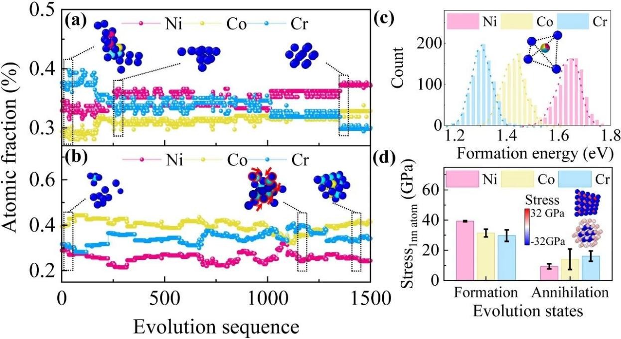 针对这一关键科学问题,该工作开发了一种基于缺陷演化速率的长时间动力学模拟(DRLD)方法,首次实现了具有可与实验对比的长时间尺度和原子级空间分辨信息的高效率模拟。研究团队基于DRLD方法,发现面心立方复杂固溶体合金在辐照条件下会通过“空位-四面体形成与解体两步演化”的物理机制形成空洞或堆垛层错四面体,其中局域化学成分变化对缺陷演化结果起着决定性作用。这一发现在原子尺度上统一解释了以往实验中关于不同元素对辐照缺陷“促进或抑制”作用的分歧现象,并与离子辐照实验结果一致,具有重要的普适意义。