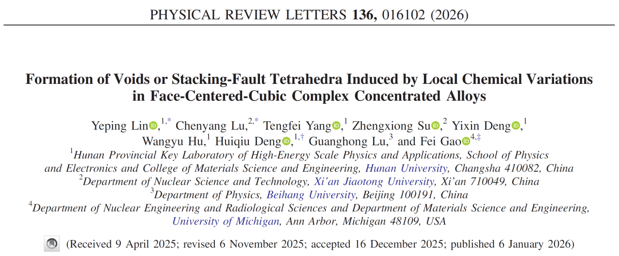 近日,西安交通大学卢晨阳教授在揭示原子尺度核材料缺陷演化规律方面取得进展,研究成果以《Formation of Voids or Stacking-Fault Tetrahedra Induced by Local Chemical Variations in Face-Centered-Cubic Complex Concentrated Alloys》于2026年1月6日发表在世界物理学顶级学术期刊《物理评论快报(Physical Review Letters)》上。该工作由湖南大学、西安交通大学、密歇根大学等单位合作完成,卢晨阳教授是文章的共同第一作者。