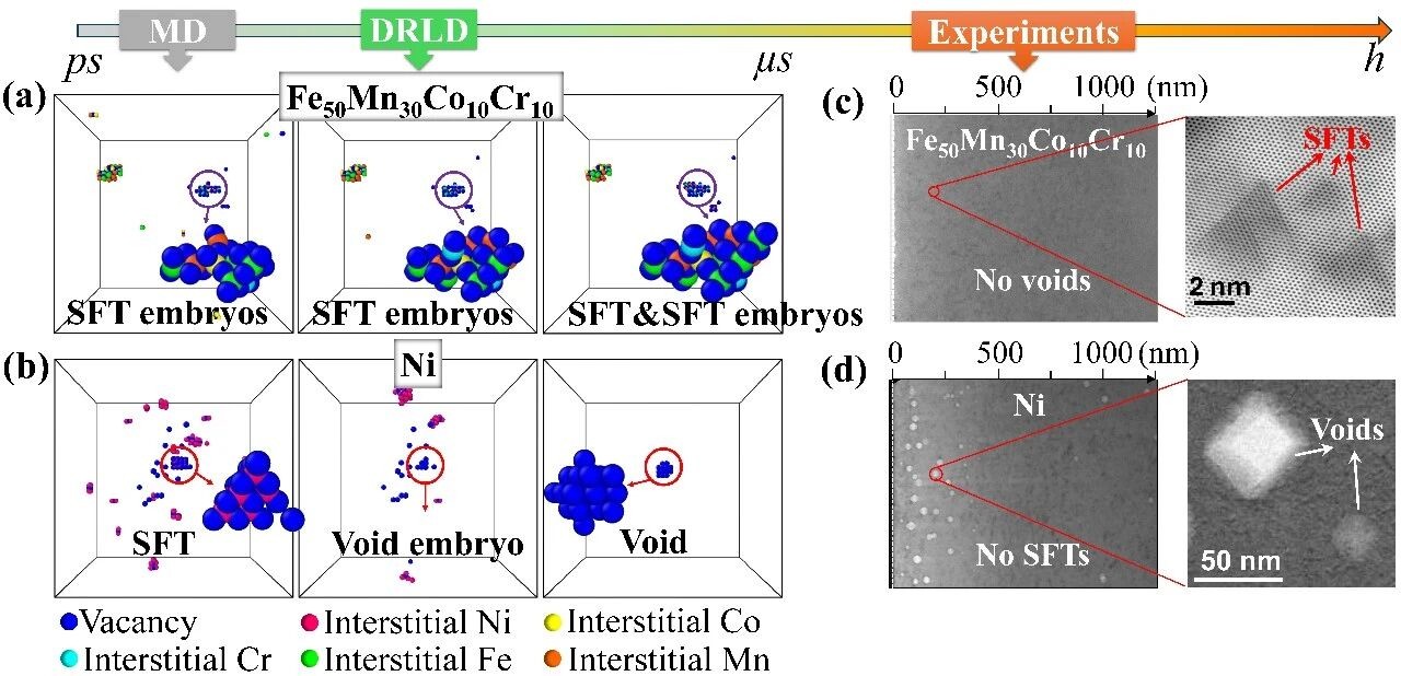 先进核裂变与核聚变反应堆材料在服役过程中,需要承受高辐照剂量和高温极端环境,这会在材料内部产生大量微观缺陷,严重影响材料的力学性能和使用寿命。其中,空洞会导致材料体积肿胀,是核材料失效的重要原因;而另一类缺陷——堆垛层错四面体,则可能在一定程度上抑制材料性能退化。长期以来,科学界尚不清楚:在相同辐照条件下,为什么有些合金更容易形成空洞,而有些则更倾向形成堆垛层错四面体?