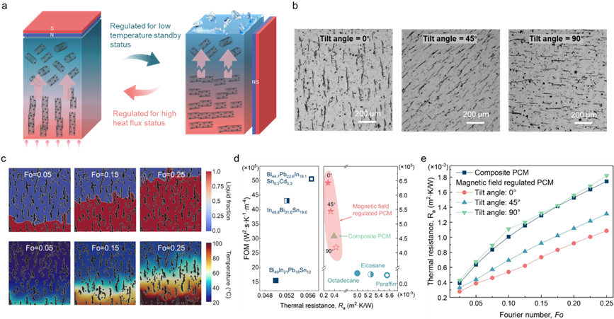 西安交通大学王秋旺教授团队联合北京大学杨林博士团队、加拿大卡尔加里大学Mohamad教授团队在磁场调谐相变材料动态热管理研究方面取得重要进展,相关成果以“通过磁场控制实现变工况下的动态热管理(Dynamic Thermal Management under Variable Operating Conditions through Magnetic Field Control)”为题于2026年1月23日在线发表在《自然·通讯》(Nature Communications)期刊上。论文链接:https://doi.org/10.1038/s41467-026-68715-7。团队受磁场诱导纳米颗粒聚集的启发,提出一种非接触式的磁控动态热管理策略。该策略通过在正二十烷基体中分散Fe3O4@碳纳米管复合纳米粒子,利用均匀磁场诱导纳米粒子沿磁感线方向聚集排列,形成可定向调控的束状热输运网络。通过改变磁场与热扩散方向的夹角,实现同材料高效散热与良好隔热双功能的原位、可逆切换,热阻调控比达1.8倍。基于该原理构建的可调谐热管理系统,使动态间歇负载工况下的电子元件温度波动降低10.8 °C,显著提升了电子设备在极端变工况下的热安全性与运行稳定性。该方法经100次以上循环验证,表现出良好的结构可逆性与性能可靠性,为高性能电子器件瞬态超高散热需求提供了可扩展的解决方案。该研究获得国家自然科学基金项目资助。