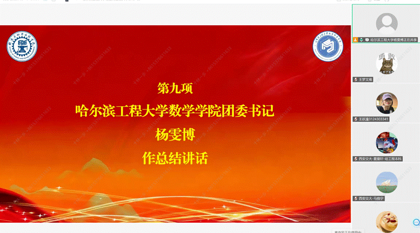 西安交通大学能动学院团委书记黄亚龙、团委副书记张玺晗、研究生辅导员马嘉谊以及八个支部140余名同学参加。会议由哈尔滨工程大学数学学院团委书记杨雯博主持。